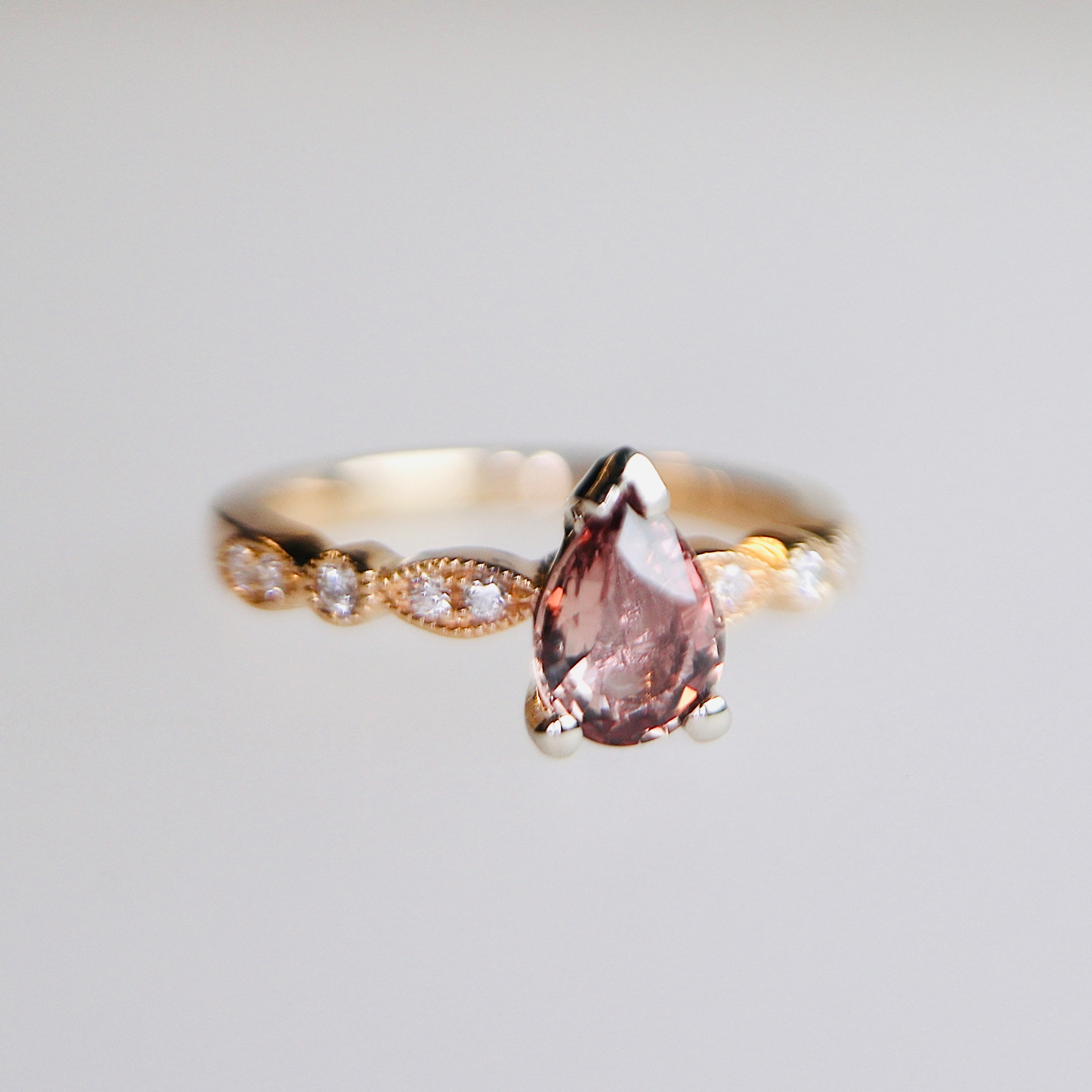 One 0.95 carat natural pear shaped wine coloured sapphire with natural diamond accents. Set in 14K and 18K. Size 6 (ring can be sized up or down free of charge with a maximum of approximately one size variance).
