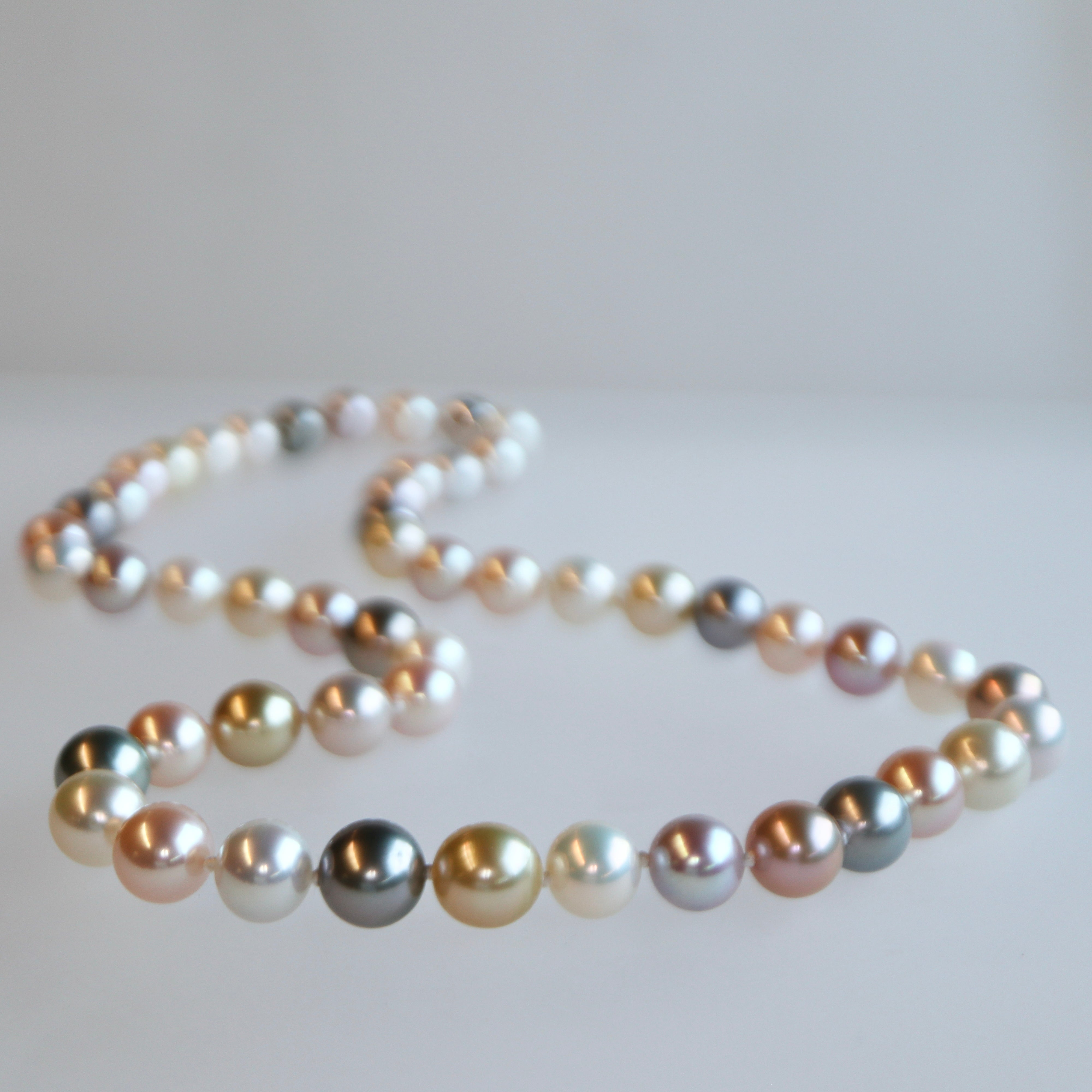 Soft pastel hues in this lovely pink, yellow, white and grey pearl necklace. Features a mixture of freshwater and Tahitian pearls and an 18K white gold polished diamond ball clasp.