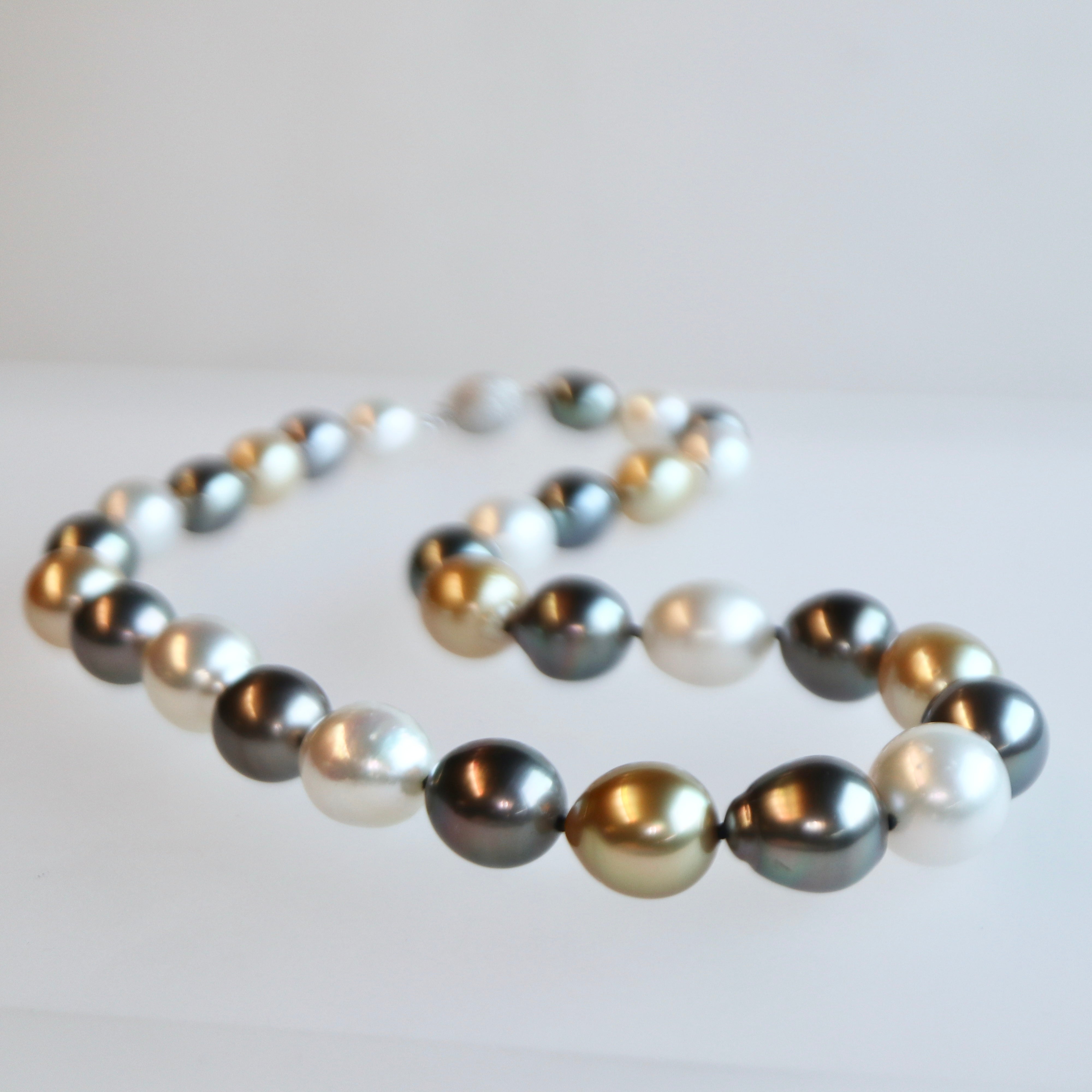Tahitian South Seas Pearl necklace featuring 10-13.8 mm pearls. 18K while gold clasp.